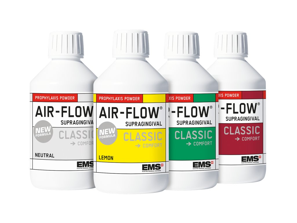 AIR-FLOW® CLASSIC COMFORT – prášek na bázi hydrogenuhličitanu sodného – prošel vylepšením složení pro ještě větší komfort pacienta.